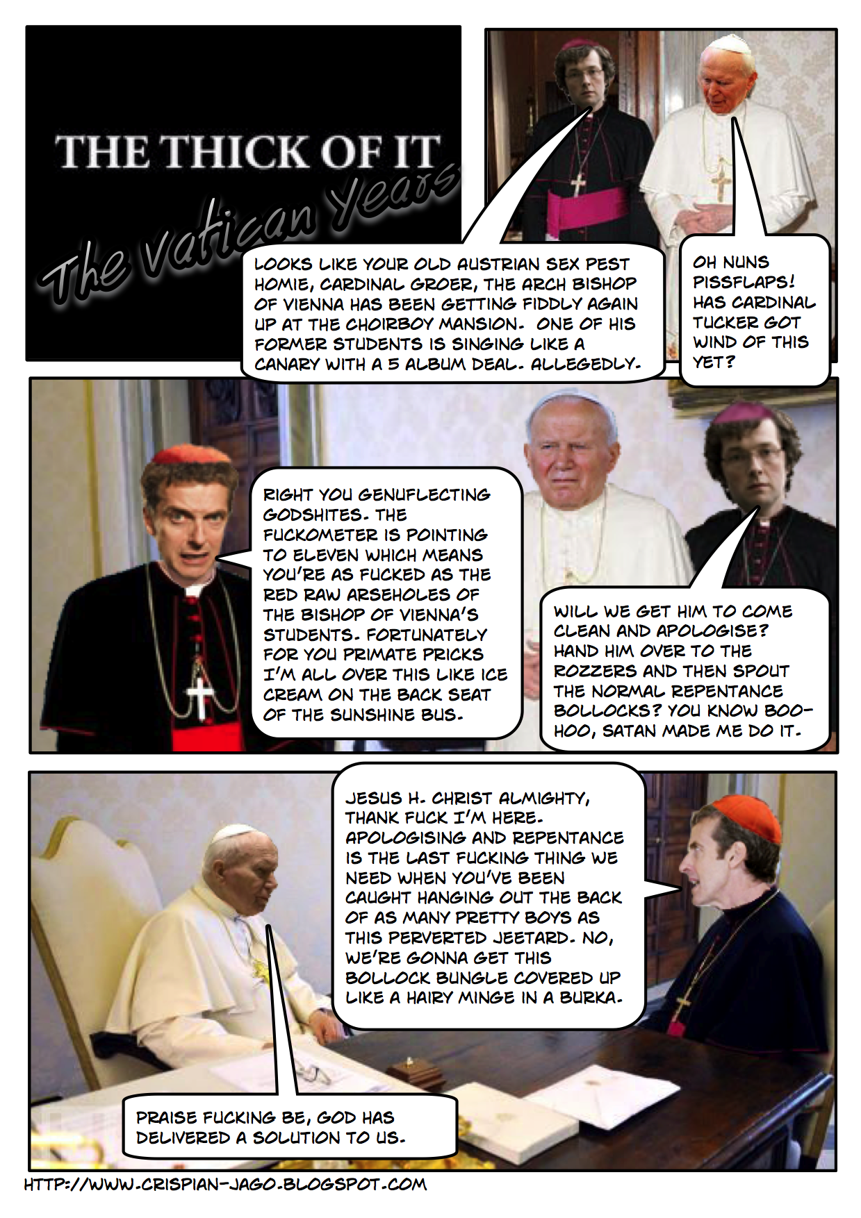 Many people are under the delusion that Armando Iannucci based the character of Malcolm Tucker on Tony Blair’s spin doctor, Alistair Campbell. This is of course a vicious and unfounded falsehood. Minimal and shoddy investigations by The Reason Stick's research department has uncovered that the character in question is in fact wholly based on Cardinal Tucker, a Papal Adviser based in the Vatican during the previous Papacy.